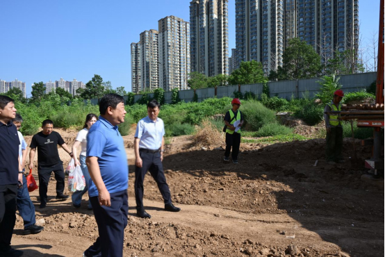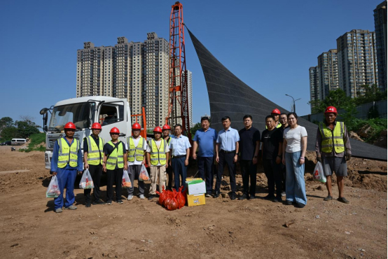 在“升龙城B区岩土工程勘察项目”现场,曹董事长一行甫一抵达,便直奔施工核心区域。在大型设备操作点等关键部位,曹董事长认真细致查看勘察工作流程以及安全生产措施落实细节:作业人员安全防护装备是否佩戴到位、临时用电线路是否规范铺设、机械设备运行维护是否严格执行规程等。每到一处,董事长一行都要向项目负责人和外业人员详细询问日常管理流程与风险管控手段,不放过任何一个可能存在的安全隐患。在项目临时搭建的遮阳棚下,曹董事长关切道:“最近一段时间,洛阳持续高温,看到大家在这样酷热的天气下依然坚守岗位,为公司发展挥洒汗水,我代表公司向大家表示最诚挚的感谢!你们辛苦了!也希望大家在做好工作的同时合理安排作息时间,注意防暑降温。